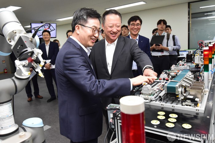[서울=뉴스핌] 최상수 기자 = 김동연 경제부총리 겸 기획재정부 장관, 박용만 대한상공회의소 회장이 16일 서울 화곡동에 위치한 대한상공회의소 서울기술교육센터를 방문하여 지능형 생산 시스템을 시연하고 있다. 2018.08.16 kilroy023@newspim.com