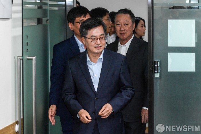 [서울=뉴스핌] 최상수 기자 = 김동연 경제부총리 겸 기획재정부 장관과 박용만 대한상공회의소 회장이 16일 오후 서울 강서구 대한상공회의소 서울기술교육센터를 방문해 직업훈련 참가자 및 강사들과 간담회를 하기 위해 회의실로 들어서고 있다. 2018.08.16 kilroy023@newspim.com