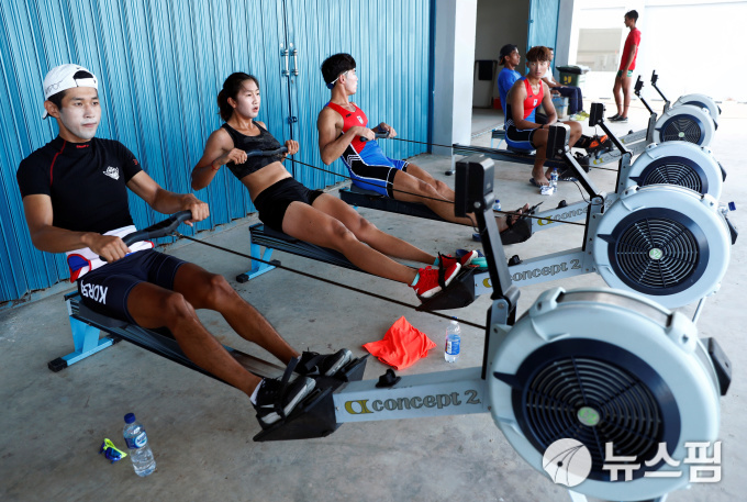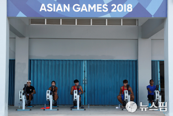 [팔렘방 로이터=뉴스핌] 신유리 인턴기자 = 2018 자카르타-팔렘방 아시안게임에 출전하는 한국 조정 선수들이 16일(현지시각) 인도네시아 팔렘방에 위치한 조정 및 카누 훈련장에서 트레이닝을 하고 있다.