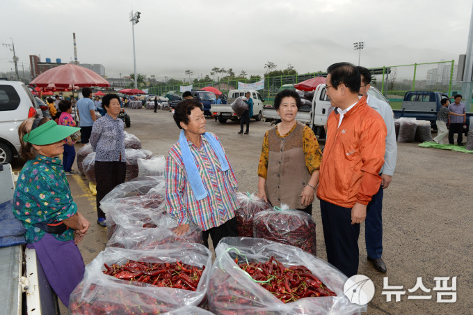 한정우 창녕군수는 28일 새벽 고추·마늘시장을 찾아 고온과 긴 가뭄으로 작황이 좋지 않은 고추 시세와 수급 상황 등을 점검하며 농민들을 격려했다.