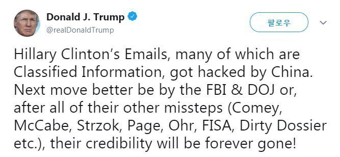 앞서 트럼프 대통령은 자신의 트위터에 "많은 기밀정보가 담긴 힐러리 클린턴의 이메일이 중국에 의해 해킹당했다"고 적었다. 이어 그는 "FBI와 미 법무부(DOJ)가 다음 조치를 취해야 한다. 그렇지 않으면 이전에 저지른 실수들에 이어 그들의 신뢰성은 영원히 사라질 것"이라며 FBI와 법무부에 수사를 촉구했다. 하지만 트럼프 대통령은 이와 관련된 증거와 추가적인 정보는 내놓지 않았다.