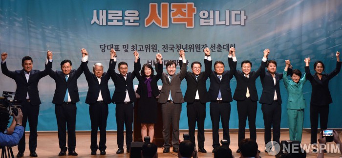 [서울=뉴스핌] 김학선 기자 = 2일 오후 서울 여의도 국회 의원회관 대회의실에서 열린 바른미래당 당대표 및 최고위원 및 전국청년위원장 선출대회에서 김동철 비상대책위원장 등 지도부와 후보자들이 손을 맞잡고 있다. 왼쪽부터 오신환 비대위원, 김관영 원내대표, 김 위원장, 채이배 정책위의장 권한대행, 이지현 비대위원, 하태경, 정운천, 김영환, 손학규, 이준석, 권은희, 김수민 후보. 2018.09.02 yooksa@newspim.com
