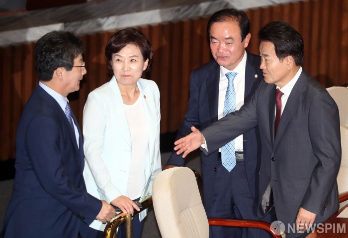 [서울=뉴스핌] 김학선 기자 = 3일 오후 서울 여의도 국회 본회의장에서 열린 정기국회 개회식에서 정동영 민주평화당 대표(오른쪽)와 유승민 전 바른미래당 공동대표가 인사를 나누고 있다. 2018.09.03 yooksa@newspim.com