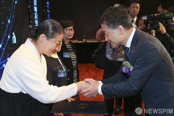 [서울=뉴스핌] 이형석 기자 = 박능후 보건복지부 장관이 7일 오전 서울 여의도 63컨벤션센터에서 열린 제19회 사회복지의 날 기념식 및 제29회 전국사회복지대회에서 강정숙 제주원광요양원 시설장에게 국민훈장을 수여하고 있다. 2018.09.07 leehs@newspim.com