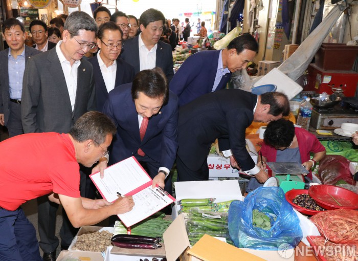 [서울=뉴스핌] 이윤청 기자 = 자유한국당 김병준 비상대책위원장, 김성태 원내대표를 비롯한 참석자들이 10일 오전 서울 영등포전통시장에서 열린 소상공인 자영업자 생존권 확보를 위한 최저임금 제도개혁 범국민 서명운동 선포식을 마치고 서명을 받고 있다. 2018.09.10 deepblue@newspim.com
