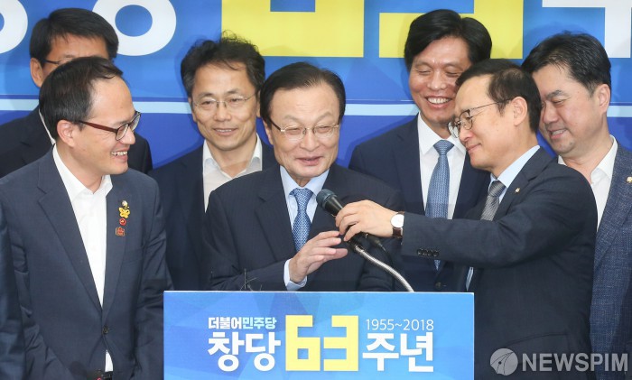 [서울=뉴스핌] 최상수 기자 = 이해찬 더불어민주당 대표(가운데), 홍영표 원내대표 등 참석자들이 17일 오전 서울 여의도 국회에서 열린 창당 63주년 기념일 기념식에서 활짝 웃고 있다. 2018.09.17 kilroy023@newspim.com