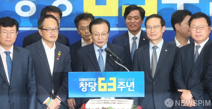 [서울=뉴스핌] 최상수 기자 = 이해찬 더불어민주당 대표가 17일 오전 서울 여의도 국회에서 열린 창당 63주년 기념일 기념식에서 기념사를 하고 있다. 2018.09.17 kilroy023@newspim.com