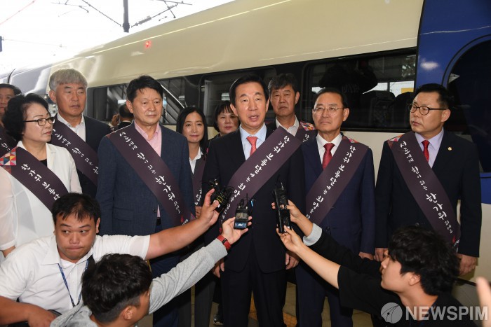[서울=뉴스핌] 최상수 기자 = 김성태 자유한국당 원내대표 및 당 지도부 등이 21일 오전 서울역 승강장에서 추석 귀성객들에게 인사도중 심재철 의원실의 검찰 압수수색에 대해 항의발언을 하고 있다. 2018.09.21 kilroy023@newspim.com