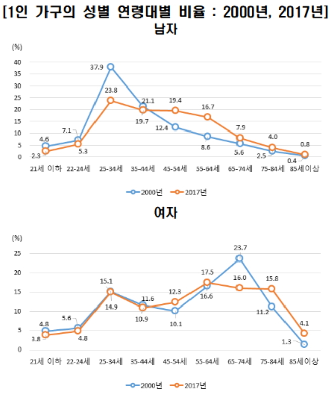2017년 1인 가구 비율이 가장 높은 연령이 남자는 30세, 여자는 83세로 나타났다. 남자는 30세로 전체의 22.5%를 차지하면서 2000년 대비 3세 높아졌다(그래프 참고).