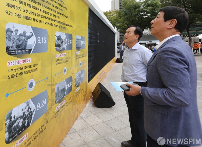 [서울=뉴스핌] 이윤청 기자 = 28일 오전 서울 중구 서울도서관 앞에서 열린 '서울수복 68주년 사진전'에서 시민들이 전시를 관람하고 있다. 서울시는 서울수복(1950년 9월28일) 제68주년을 맞아 오는 29일까지 사진전 및 기념행사를 개최한다. 2018.09.28 deepblue@newspim.com