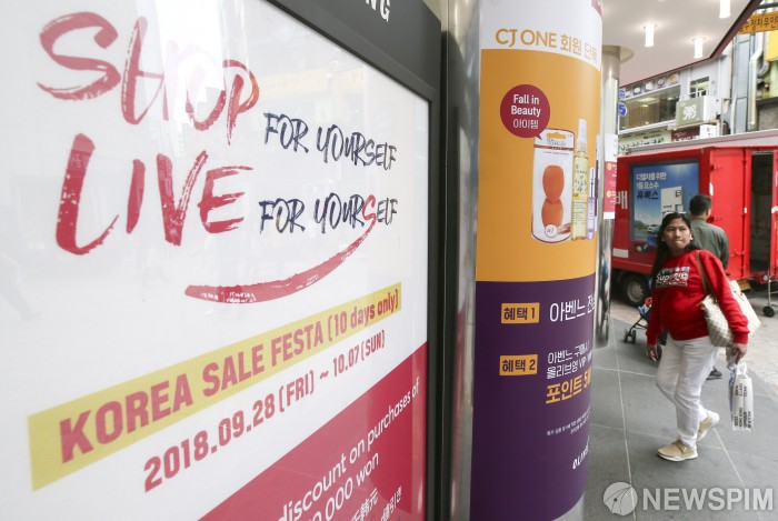 [서울=뉴스핌] 이형석 기자 = 국내 최대 쇼핑관광축제인 코리아세일페스타가 오늘(28일)부터 내달 7일까지 10일간 개최된다. 서울 중구 명동거리에 코리아세일페스타를 알리는 포스터가 붙어 있다. 2018.09.28 leehs@newspim.com
