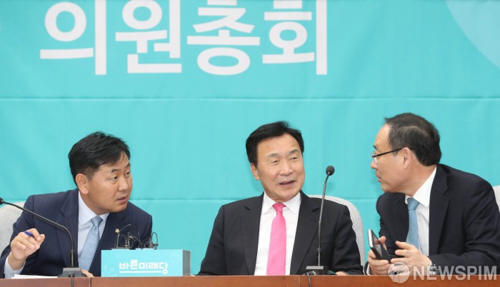 [서울=뉴스핌] 김학선 기자 = 김관영 바른미래당 원내대표(왼쪽부터), 손학규 대표, 오세정 의원이 1일 오후 국회에서 열린 의원총회에서 이야기를 나누고 있다. 오 의원은 의원직을 사퇴하고 서울대 총장 선거에 출사표를 던졌다. 2018.10.01 yooksa@newspim.com