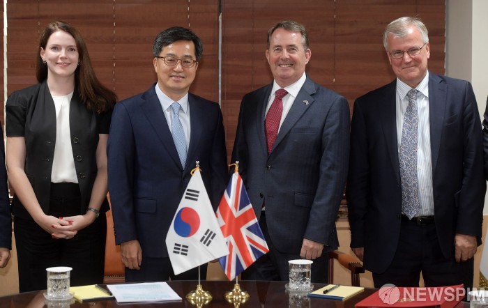 [서울=뉴스핌] 김학선 기자 = 김동연 경제부총리 겸 기획재정부 장관이 5일 서울 종로구 정부서울청사를 방문한 리암 폭스 영국 국제통상장관(왼쪽 세 번째)과 나탈리 블랙 아시아태평양 국제통상대사(첫 번째), 사이먼 스미스 주한 영국대사와 기념촬영을 하고 있다. 2018.10.05 yooksa@newspim.com