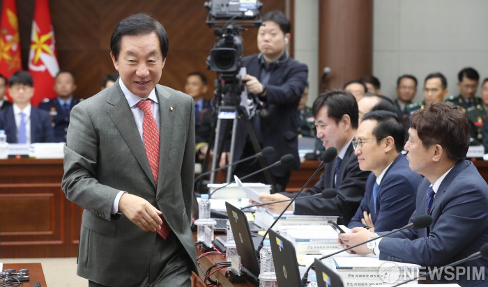 [서울=뉴스핌] 김학선 기자 = 김성태 자유한국당 원내대표가 10일 서울 용산구 국방부에서 열린 국회 국방위원회의 국방부에 대한 국정감사에서 홍영표 더불어민주당 원내대표와 인사를 나눈 후 자리로 향하고 있다. 2018.10.10 yooksa@newspim.com