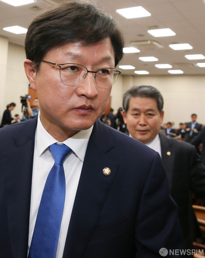 [서울=뉴스핌] 최상수 기자 = 강병원 더불어민주당 의원, 김경협 의원이 16일 오전 서울 여의도 국회에서 열린 기획재정위원회의 한국수출입은행, 한국재정정보원 등에 대한 국정감사에서 굳은 표정으로 회의실을 나서고 있다. 2018.10.16 kilroy023@newspim.com