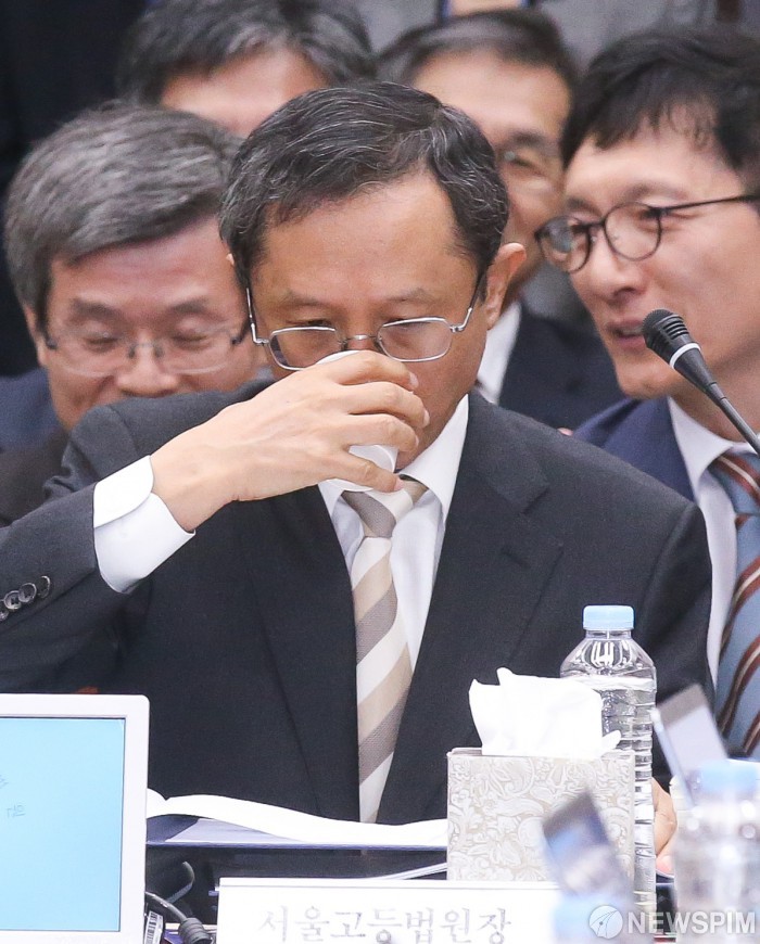 [서울=뉴스핌] 최상수 기자 = 최완주 서울고등법원장이 18일 오전 서울 서초구 서울고등법원에서 열린 법제사법위원회의 국정감사에서 물을 마시고 있다. 2018.10.18 kilroy023@newspim.com