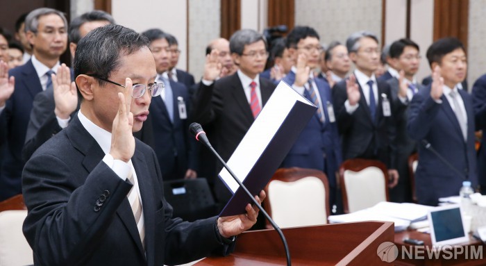 [서울=뉴스핌] 최상수 기자 = 최완주 서울고등법원장이 18일 오전 서울 서초구 서울고등법원에서 열린 법제사법위원회의 국정감사에서 선서를 하고 있다. 2018.10.18 kilroy023@newspim.com