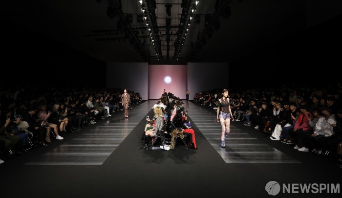[서울=뉴스핌] 이윤청 기자 = 18일 오후 서울 중구 동대문디자인플라자(DDP)에서 열린 2019 S/S 헤라서울패션위크 키미제이(KIMMYJ) 컬렉션에서 모델들이 화려한 무대를 선보이고 있다. 2018.10.18 deepblue@newspim.com