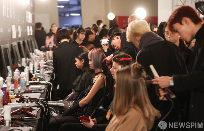 [서울=뉴스핌] 이윤청 기자 = 18일 오후 서울 중구 동대문디자인플라자(DDP)에서 열린 2019 S/S 헤라서울패션위크의 백스테이지에서 모델들이 메이크업을 수정하고 있다. 2018.10.18 deepblue@newspim.com