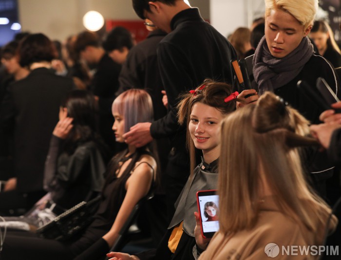 [서울=뉴스핌] 이윤청 기자 = 18일 오후 서울 중구 동대문디자인플라자(DDP)에서 열린 2019 S/S 헤라서울패션위크의 백스테이지에서 모델들이 메이크업을 수정하고 있다. 2018.10.18 deepblue@newspim.com