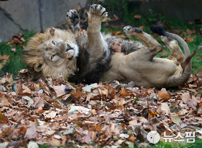 | [런던 로이터=뉴스핌] 조재완 기자 = 영국 런던동물원에서 인도사자 ‘바누’가 낙엽 위를 구르고 있다. 2018.10.18. |