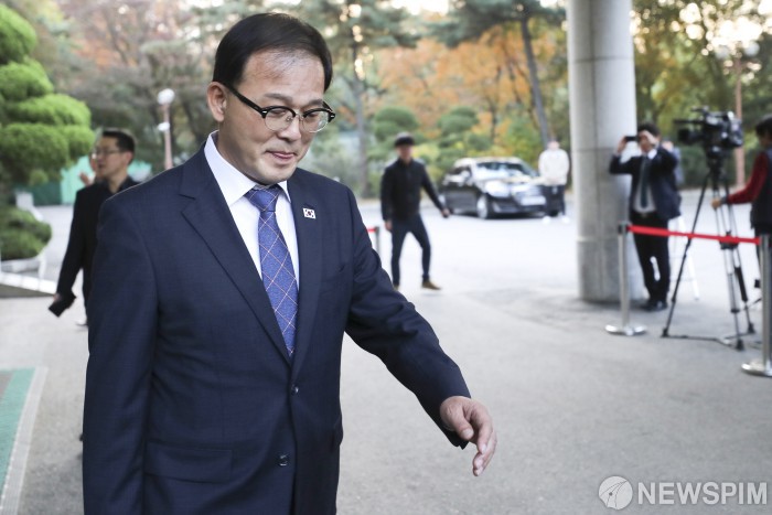 [서울=뉴스핌] 사진공동취재단 = 남북 산립협력 회담 남쪽 수석대표를 맡은 박종호 산림처 차장이 22일 오전 서울 종로구 남북회담본부에서 회담장소인 개성 남북공동연락사무소로 출발하고 있다. 2018.10.22
