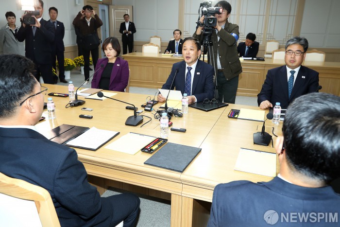 [개성=뉴스핌] 사진공동취재단 = 22일 오후 개성 남북공동연락사무소에서 남북 산림협력분과회담 종결회의가 진행되고 있다. 박종호 산림청 차장(가운데)이 마무리 인사를 하고 있다. 2018.10.22