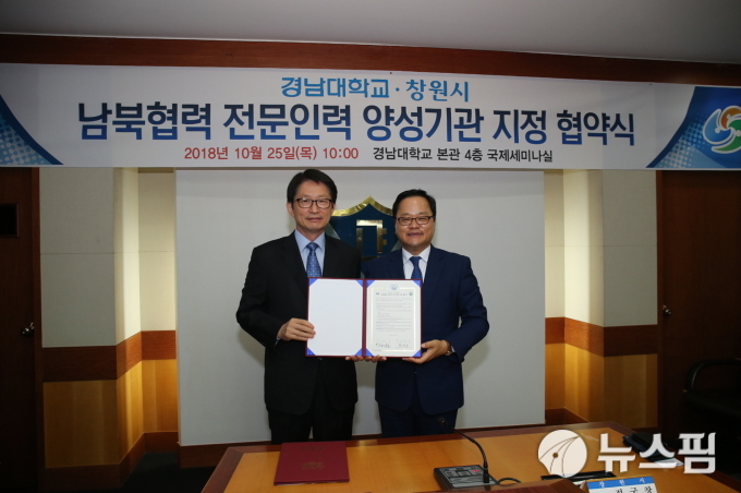 [창원=뉴스핌] 남경문 기자 = 창원시는 25일 경남대학교 본관 4층 국제세미나실에서 경남대와 ‘남북협력 전문인력 양성’ 공동사업 추진을 위한 업무협약을 체결했다.