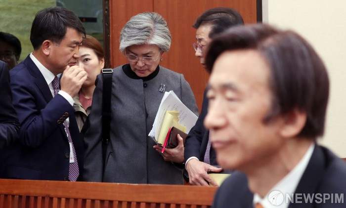 [서울=뉴스핌] 김학선 기자 = 윤병세 전 외교부 장관이 26일 국회에서 열린 외교통일위원회의 외교부 등에 대한 종합감사에 증인으로 출석한 가운데 강경화 외교부 장관이 관계자와 이야기를 나누고 있다. 2018.10.26 yooksa@newspim.com
