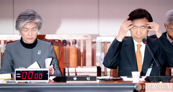 [서울=뉴스핌] 김학선 기자 = 강경화 외교부 장관과 윤병세 전 외교부 장관이 26일 국회에서 열린 외교통일위원회의 외교부 등에 대한 종합감사에서 나란히 증인석에 앉아 있다. 2018.10.26 yooksa@newspim.com