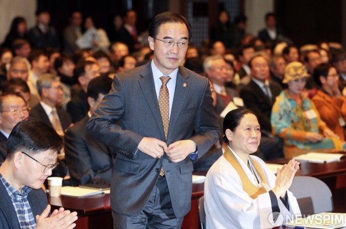 [서울=뉴스핌] 이형석 기자 = 조명균 통일부 장관이 1일 오전 서울 중구 프레스센터에서 열린 평화, 통일 비전 사회적대화를 위한 전국시민회의 발기인대회에서 축사를 위해 이동하고 있다. 2018.11.01 leehs@newspim.com