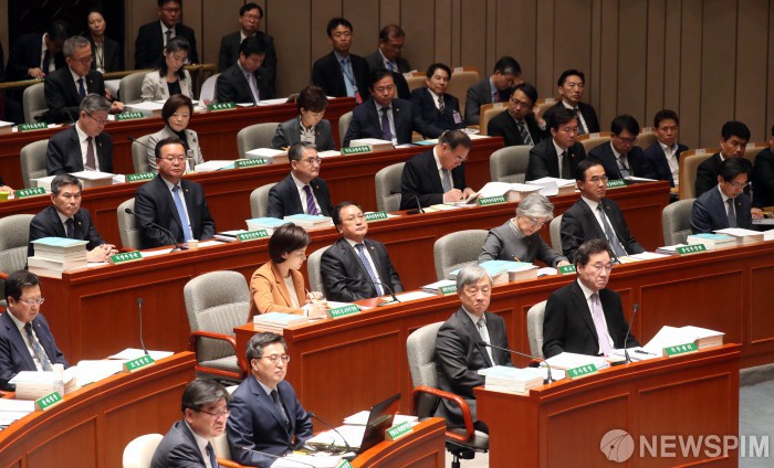 [서울=뉴스핌] 김학선 기자 = 이낙연 국무총리를 비롯해 국무위원들이 5일 국회에서 2019년도 예산안 심사와 관련해 열린 예산결산특별위원회 전체회의에 출석, 의원들의 발언을 듣고 있다. 2018.11.05 yooksa@newspim.com