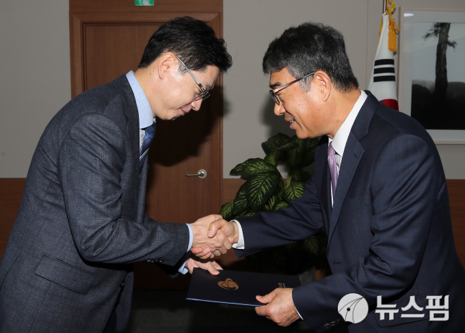 [창원=뉴스핌] 남경문 기자 = 김경수 경남도지사는 7일 오전 도지사 집무실에서 출연기관인 (재)경남테크노파크(이하 경남TP) 8대 안완기 원장에게 임명장을 수여했다.