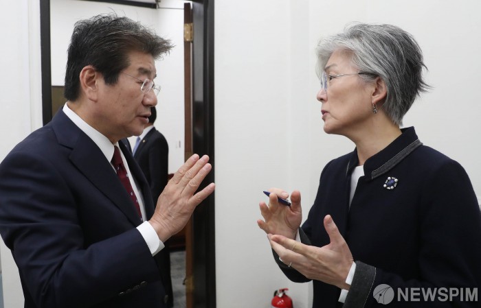 [서울=뉴스핌] 김학선 기자 = 강경화 외교부 장관이 8일 국회에서 열린 외교통일위원회의 외교부, 통일부 소관 내년도 예산안 논의를 위한 전체회의에서 본인의 행사 참석으로 인한 이석 문제로 정회가 선포되자 강석호 위원장을 찾아가 이야기를 나누고 있다. 2018.11.08 yooksa@newspim.com