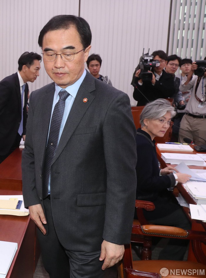 [서울=뉴스핌] 김학선 기자 = 조명균 통일부 장관이 8일 국회에서 열린 외교통일위원회의 외교부, 통일부 소관 내년도 예산안 논의를 위한 전체회의가 정회되자 자리에서 일어나고 있다. 이날 외통위 전체회의는 강경화 외교부 장관이 포항에서 열리는 한-러 지방협력포럼 참석차 이석하는 것에 대한 야당 의원들의 지적으로 정회됐다. 2018.11.08 yooksa@newspim.com