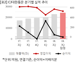 CJ대한통운은 올해 3분기 연결기준 잠정 매출액이 2조4184억원으로 전년 동기 1조8732억원 대비 29.1% 늘었다. 같은기간 영업이익은 528억5700만원으로 전년 동기 626억2600만원 대비 15.6% 줄었다. 지배지분 순이익은 -1억7600만원으로 전년 동기 92억7300만원에서 적자전환했다.