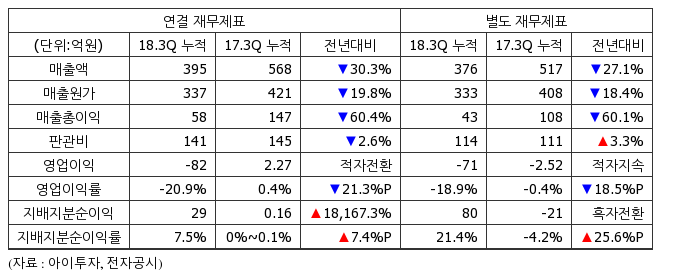 올해 3분기 누적 기준 연결 매출액은 395억9056만원으로 전년 동기 568억7080만원 대비 30.3% 감소했다.