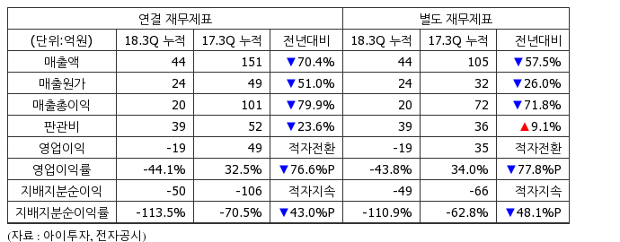 올해 3분기 누적 기준 연결 매출액은 44억5868만원으로 전년 동기 151억778만원 대비 70.4% 감소했다.