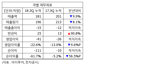 영업이익이 -41억575만원으로 적자를 지속했고, 순이익은 -111억9215만원으로 적자를 지속했다했다.