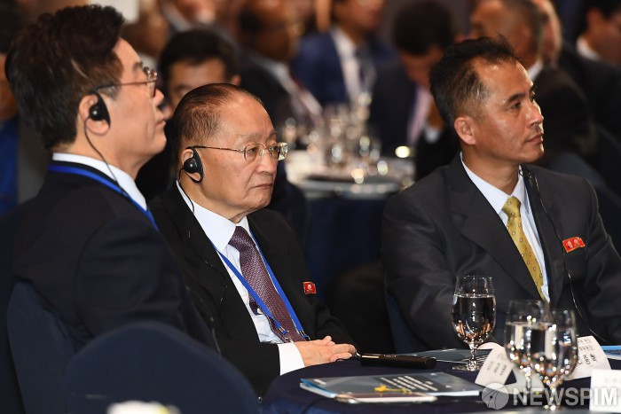 [고양=뉴스핌] 사진공동취재단 = 이재명 경기도지사, 북한 리종혁 조선아시아태평양위원회 부위원장이 16일 오후 경기도 고양시 장항동 엠블호텔 고양에서 열린 '아시아·태평양 평화번영을 위한 국제대회'에서 하토야마 유키오 전 일본 총리의 기조연설을 듣고 있다.