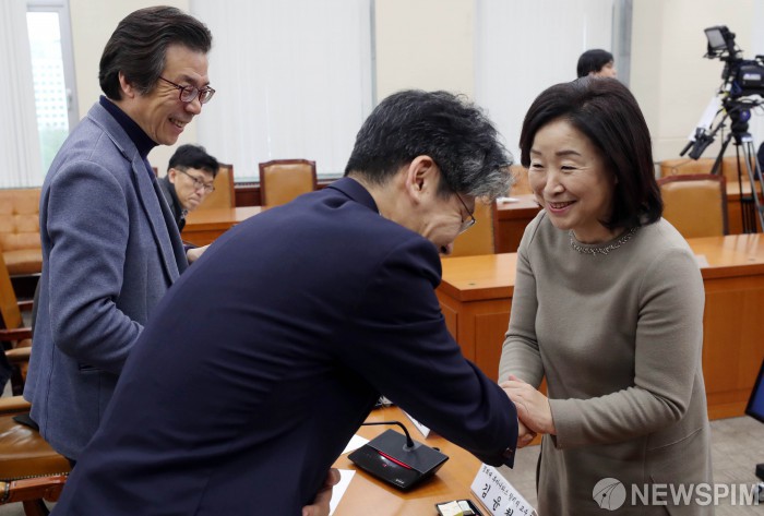 [서울=뉴스핌] 김학선 기자 = 심상정 정치개혁특별위원회 위원장이 21일 국회에서 열린 정치제도 개혁 관련 공청회에 참석한 교수들과 인사를 나누고 있다. 2018.11.21 yooksa@newspim.com