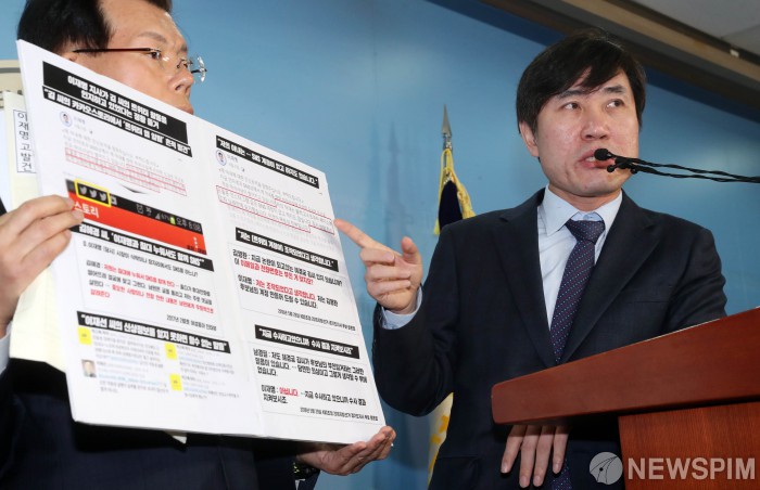 [서울=뉴스핌] 김학선 기자 = 하태경 바른미래당 의원과 장영하 바른미래당 성남판 적폐인물 이재명, 은수미 진실은폐 진상조사위원회 전 위원장이 22일 국회 정론관에서 이재명 경기도지사 관련 기자회견을 하고 있다. 2018.11.22 yooksa@newspim.com