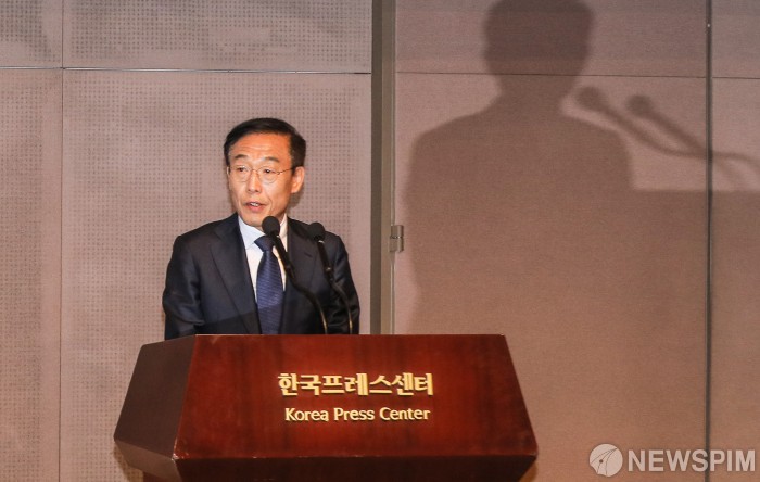 [서울=뉴스핌] 윤창빈 수습기자 = 김기남 삼성전자 대표이사가 23일 광화문 프레스센터에서 열린 ‘삼성전자-반올림 중재판정 이행합의서 협약식’에서 사과문을 전하고있다 . 2018.11.23 pangbin@newspim.com