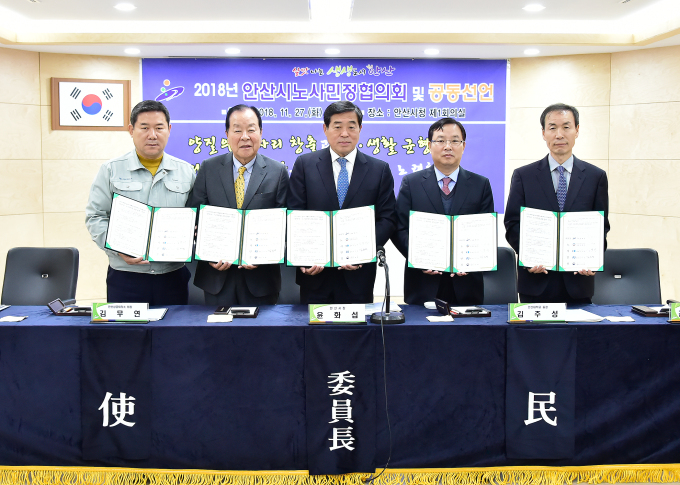 [안산=뉴스핌] 노호근 기자 = 안산시노사민정협의회는 지난 27일 안산시청 제1회의실에서 시민이 원하는 일자리 창출과 노동친화도시 조성을 위한 '노사민정 공동 실천 선언문'을 발표했다.