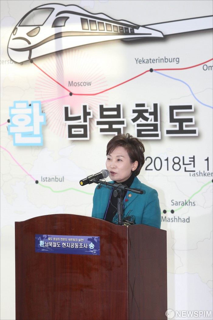 [도라산=뉴스핌] 사진공동취재단 = 김현미 국토교통부 장관이 30일 오전 경기도 파주시 도라산역에서 열린 남북 철도 공동 현지조사를 위해 신의주로 떠나는 조사단 환송식에서 축사를 하고 있다. 2018.11.30