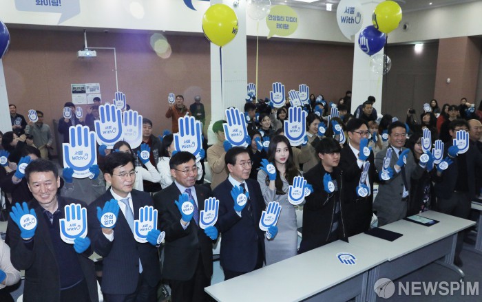 [서울=뉴스핌] 윤창빈 수습기자 = 박원순 서울시장(왼쪽 네번째),걸스데이 유라(왼쪽 다섯번쨰)가 3일 오후 서울 중구 서울시민청에서 열린 ‘서울 #With U’ 프로젝트 출범식에서 출범을 기념하는 퍼포먼스를 하고 있다. 2018.12.03 pangbin@newspim.com
