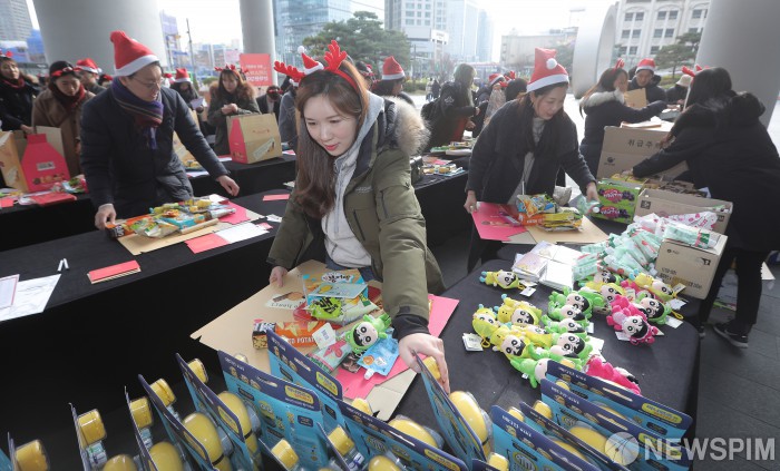 | [서울=뉴스핌] 윤창빈 수습기자 = 5일 오후 서울 용산구 용산역광장에서 진행된 ‘용산 드래곤즈 미리 크리스마스 산타원정대’ 행사에서 참가자들이 용산지역 사회복지시설 어린이들에게 줄 선물을 담고 있다. 이 날 용산에 위치한 기업들과 기관, 학교의 봉사자들이 약 100여명 참가하여 뜻깊은 시간을 가졌다. 2018.12.05 pangbin@newspim.com |
