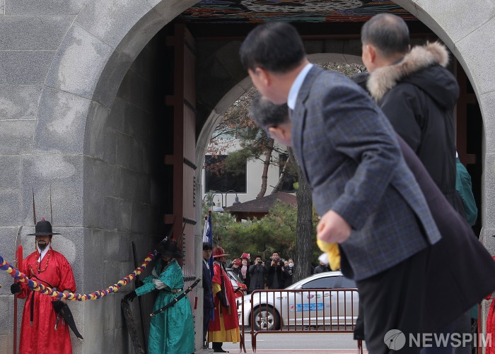 [서울=뉴스핌] 윤창빈 수습기자 = 6일 오전 서울 종로구 경복궁에서 43년만에 개방된 영추문을 행사 참석자들이 보고 있다. 영추문 개방으로 경복궁을 동서남북 모든 방향에서 출입할 수 있게 되었다. 2018.12.06 pangbin@newspim.com