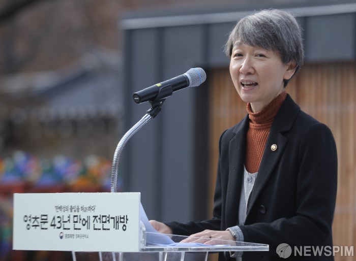 [서울=뉴스핌] 윤창빈 수습기자 =정재숙 문화재청장이 6일 오전 서울 종로구 경복궁에서 열린 '영추문 43년 만에 전면개방' 행사에서 축사를 하고 있다. 영추문 개방으로 경복궁을 동서남북 모든 방향에서 출입할 수 있게 되었다. 2018.12.06 pangbin@newspim.com