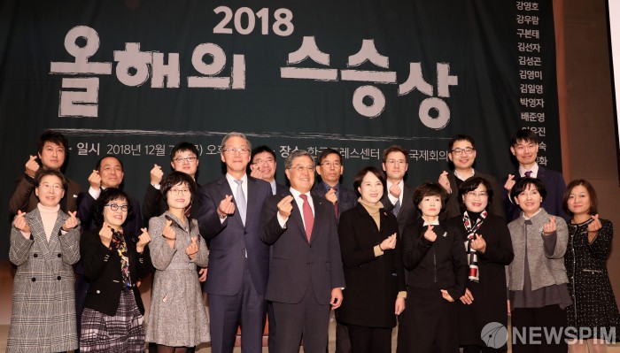 [서울=뉴스핌] 정일구 기자 = 유은혜 교육부 장관이 7일 오후 서울 중구 한국프레스센터에서 열린 '2018 올해의 스승상' 시상식에서 수상자들과 기념촬영을 하고 있다. 2018.12.07 mironj19@newspim.com